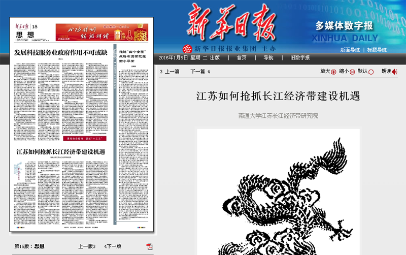 1月5日出版的新华日报第15版思想专版,刊登了beat365官网江苏长江经济带研究院的文章《江苏如何抢抓长江经济带建设机遇》。