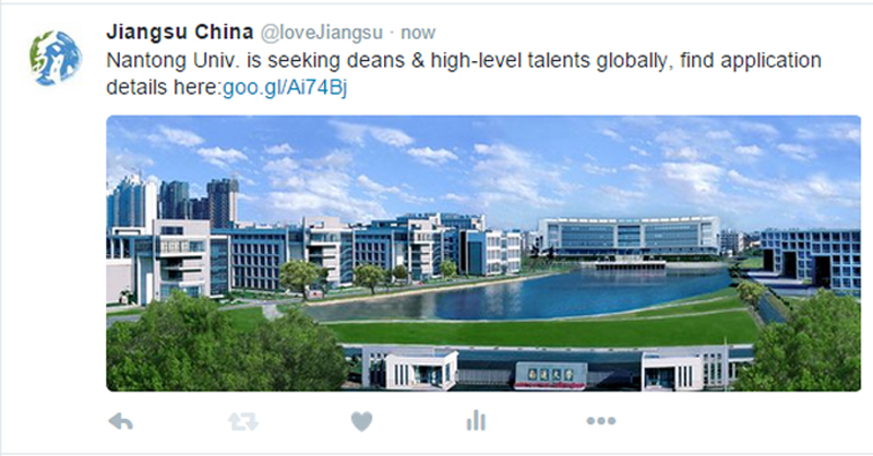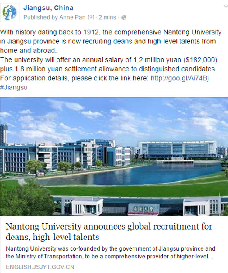 2月4日,中共江苏省委分别在其Facebook和Twitter的官方账号Jiangsu China中推出beat365官网面向全球高薪招聘高层次人才的信息。