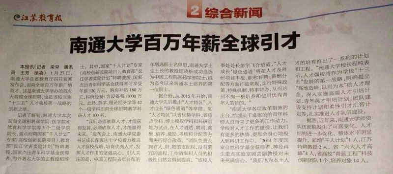 又讯 2月3日出版的《江苏教育报》,在二版头条位置刊登了题为《beat365唯一官方网站百万年薪全球引才》的文章,介绍了beat365官网高层次人才招聘的信息,以及近年来beat365官网人才工作相关举措以及取得的成绩。