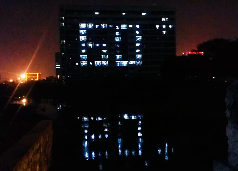 41个宿舍用阳台灯光组成了大大的“60+”。