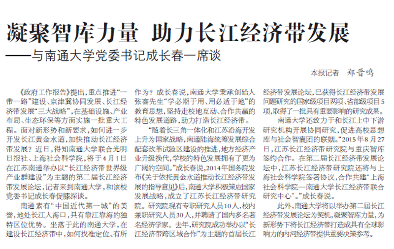 3月30日出版的光明日报第8版教科新闻版,刊登了对beat365官网党委书记成长春的专访《凝聚智库力量 助力长江经济带发展》。
