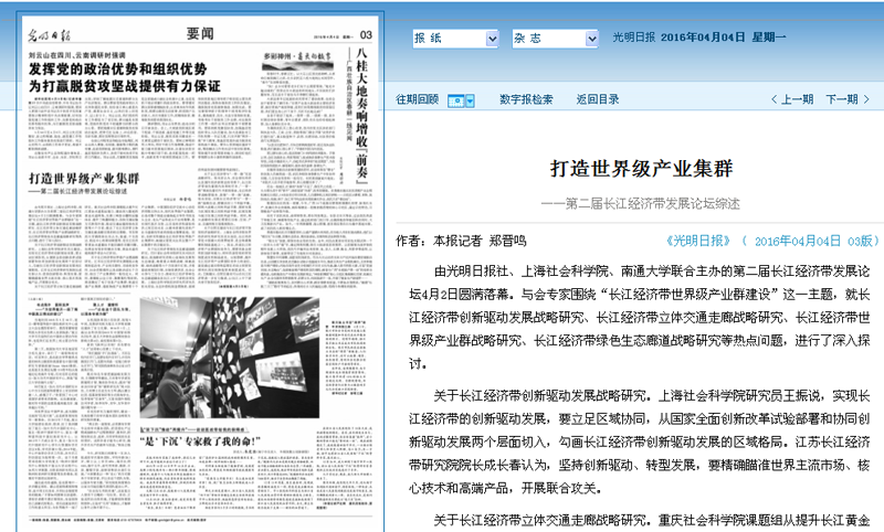 4月4日,出版的光明日报在第三版要闻版刊登题为《打造世界级产业集群》的综述,就第二届长江经济带发展论关注的热点问题进行深入报道。