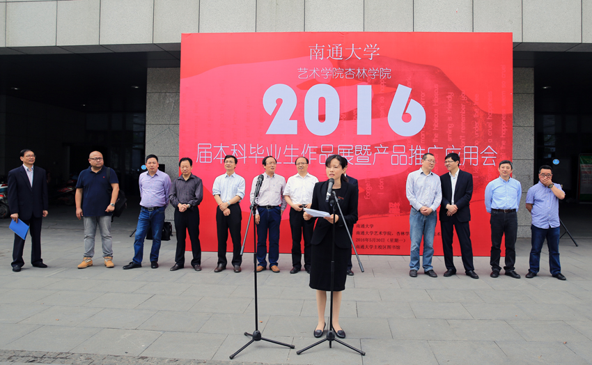 5月30日上午,beat365官网2016届艺术专业毕业作品展暨产品推广应用会在主校区图书馆举行。南通市书协主席丘石,南通市博物苑党支部书记周昶,南通市书画研究院院长康戎、副院长张卫,江苏政田重工股份有限公司、南通通机股份有限公司、江苏金太阳纺织科技有限公司、紫罗兰家纺科技股份有限公司等八家企业负责人出席活动。副校长顾菊平到会致辞。