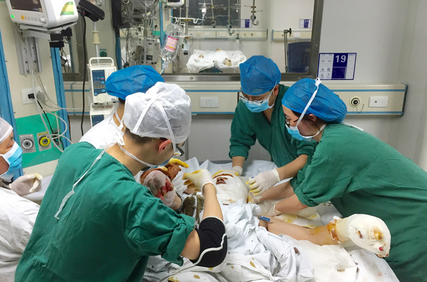 晚7时许,爆炸伤员陆续到达通大附院,该批伤员涉及爆炸烧伤、呼吸道吸入伤、爆震伤和多发性骨折等损伤,早已严阵以待的医务人员按照预案有序地对伤员实施清创、敷料包扎、深静脉置管、气管切开等紧急处置,给予补充血容量抗休克、抗感染支持等抢救措施。经过彻夜奋战,伤员得到妥善处理。