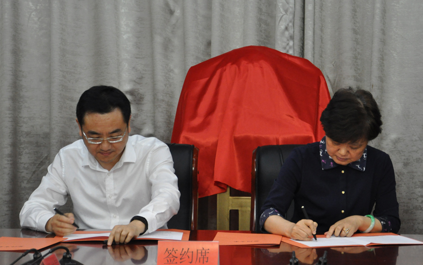 丁斐副校长与亭湖区常务副区长祁新桐代表双方签订合作协议书。