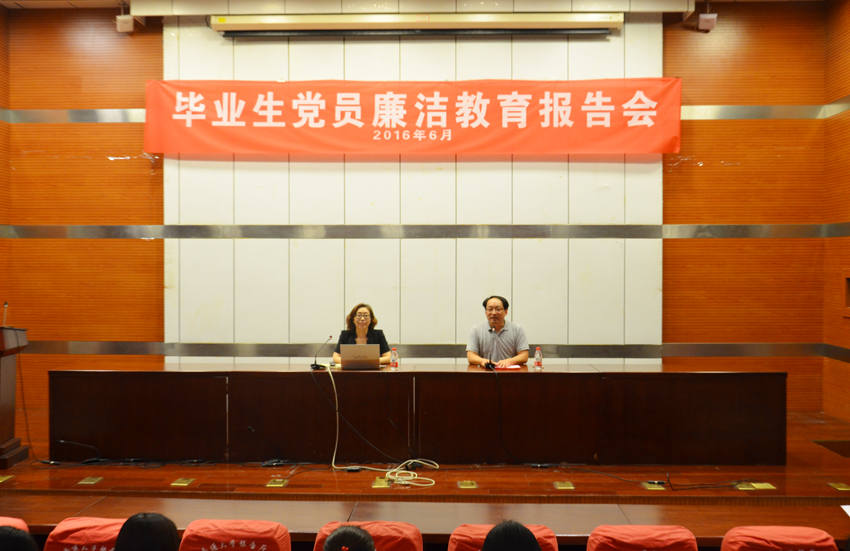 2016届本科毕业生离校前夕,学生工作部在主校区举办毕业生党员廉洁教育报告会,校纪委副书记吴菁应邀为2016届毕业生党员作廉洁教育报告。