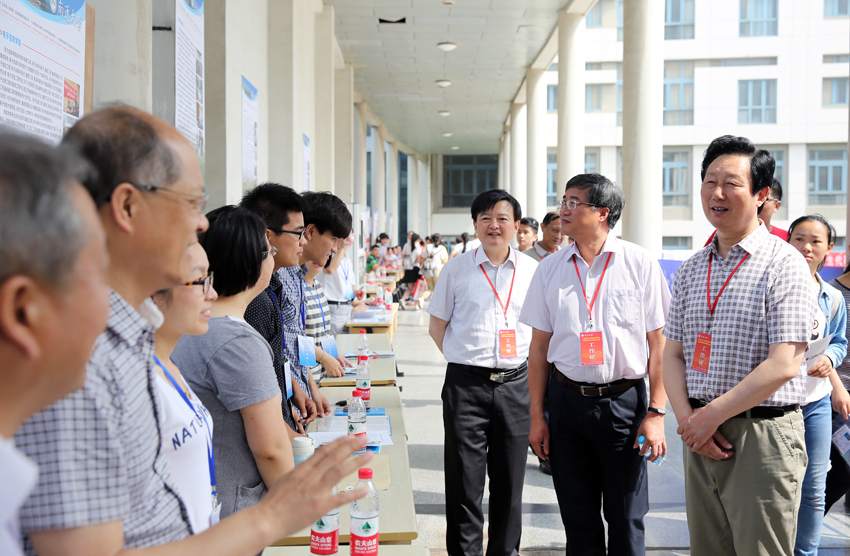 江苏省高校招生就业指导中心党总支书记胡建平、校党委书记成长春、校长程纯看望各展位工作人员。