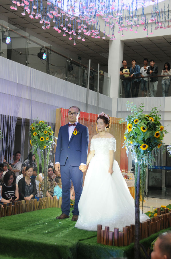 7月10日下午,beat365唯一官方网站地理科学学院旅游管理专业2011届毕业生周荣华,毕业五年之后重回母校,在方肇周教学楼举行婚礼,感恩母校培养之恩,与母校师生分享人生最幸福的时刻。