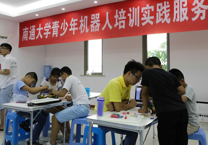 走进观音山街道世伦桥社区,远远就听到孩子们的欢笑声。电气工程学院青少年机器人培训实践服务团在世伦桥社区为观音山街道的孩子们开展机器人拼装培训。“曹力铭哥哥,这个零件总是装不上去怎么办?”正在拼装机器人的冯葛轩小朋友举起手中模型,疑惑地问道。曹力铭立刻俯下身子,检查模型结构,向冯葛轩耐心讲解。作为电气工程学院青少年机器人培训实践服务团的总负责人,曹力铭与16名团队成员一起探求更适宜于孩子们的教学方法。为调动孩子们学习机器人拼装的热情,团队成员陈东围绕孩子们喜闻乐见的《变形金刚》、《钢铁侠》等动画展开课程讲解。没有机器人成品的草图和照片,曹力铭和成员们一起利用一周的时间自主调试组装,克服电机无法带动轮轴转动、软件失误等障碍,成功拼装出BDS投篮机器人,并对零件构造了如指掌。
