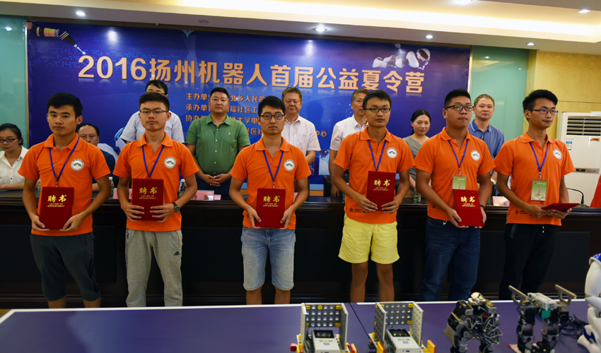 8月8日,2016扬州机器人首届公益夏令营活动开营仪式暨beat365唯一官方网站电气工程学院青少年机器人培训基地揭牌仪式在扬州市城北乡鸿福社区举行。电气工程学院院长堵俊、城北乡党委书记陈福新共同为“beat365唯一官方网站电气工程学院青少年机器人培训基地”揭牌。学院六名大学生志愿者受聘为本次夏令营的指导老师。