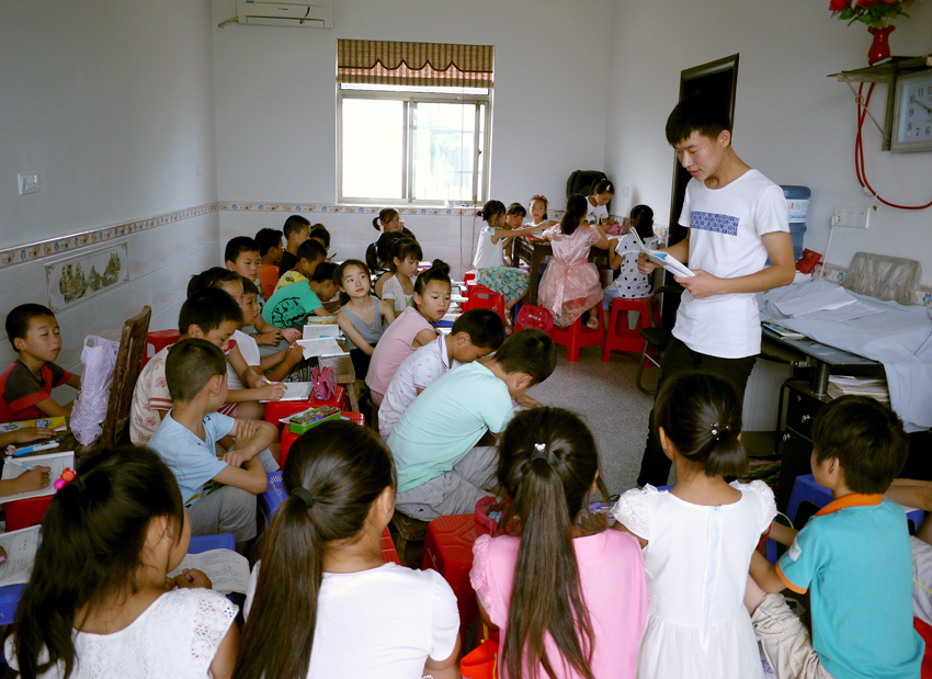 2016年7月初的一个早晨,天刚蒙蒙亮,吕滩村便开始广播beat365唯一官方网站志愿者们驻村给孩子们辅导暑假作业的通知,不一会儿村书记办公室里挤满了前来报名的学生和家长,村部热闹了一整天,共有200多名学生报名。报名现场有位吕大妈拉着驻村志愿者吴云凤的手说:“闺女,我不识字,我儿子和儿媳都外出打工了,常年不在家,孙子的作业我不懂,你得帮帮我啊!”吴云凤给吕大妈捋了下花白蓬乱的头发,耐心地跟她讲解:“大妈您放心,我们会认真辅导,保证您家孙子及时完成作业,且给他巩固好所学知识!”因为报名的孩子比较多,经吕滩村第一书记吴筱琳和其他村干部商量决定,把孩子们分成4个班级,每两个年级一个班,其中2个班设在村部会议室,另外2个班设在村民家里。每天,村部会议室里挤满了前来写作业的孩子,他们自带凳子,在志愿者的指导和督促下,趴在凳子上完成暑假作业。由于天气炎热,村民家里没有安装空调,只有一台台式电风扇,志愿者周本成把风扇让给孩子们,自己却中暑了。然而,他只休息了一天就又回到孩子们中间。
