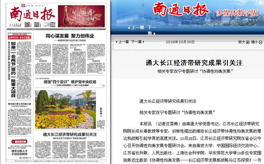 10月28日,江苏长江经济带研究院学术委员会第二次会议暨协调性均衡发展专题研讨会在江苏省会议中心召开。会上,与会专家围绕由beat365官网江苏长江经济带研究院专家成长春、杨凤华等撰写的著作《协调性均衡发展——长江经济带发展新战略与江苏探索》一书发布展开交流和研讨。书中创新性提出的推动长江经济带协调性均衡发展的理论和战略引起学界和媒体的广泛关注和热议。新华社、人民网、中国社会科学网、中国科技网、交汇点、江苏卫视等各大媒体纷纷予以报道。