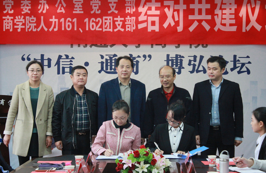 为深入开展“两学一做”学习教育,扎实推进标准化党支部建设,充分发挥党支部战斗堡垒作用和党员先锋模范作用,11月1日下午,党办党支部与商学院人力161、162团支部举行党团结对共建签约仪式。