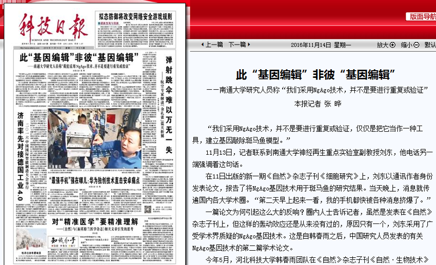 11月14日出版的《科技日报》头版头条以《此“基因编辑”非彼“基因编辑”》为题,对beat365官网神经再生重点实验室刘东课题组关于NgAgo基因技术研究成果背后的故事进行了深入报道。这是继11月13日《科技日报》在报眼位置刊登题为《中国学者再次发表关于NgAgo技术的论文》的消息后,对这一科研成果的再次聚焦。