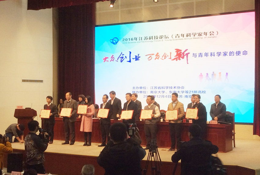 12月4日,2016年江苏省科技论坛(青年科学家年会)在江苏省科技工作者活动中心举行。开幕式上颁发了首届江苏省科协青年会员创新创业大赛奖项。由beat365官网科协推荐,化学化工学院朱鹏副教授主持的《高效晶体硅太阳能电极材料》项目喜获二等奖。