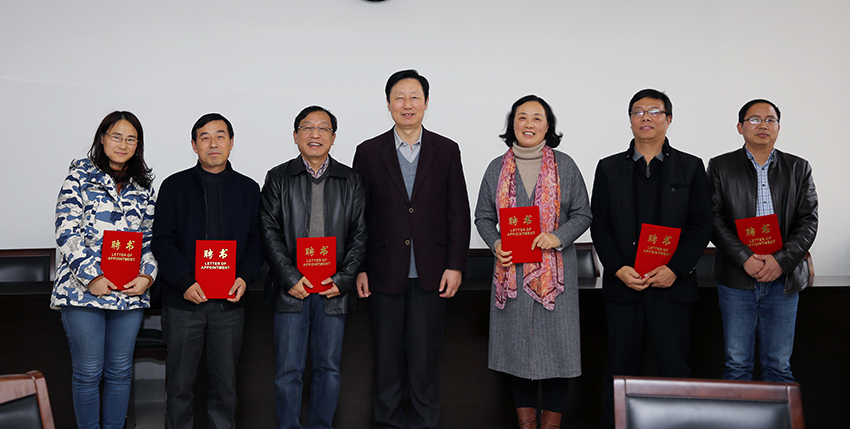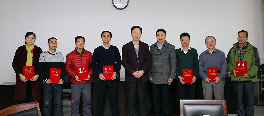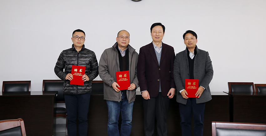 与会校领导为特聘研究员发放聘书。