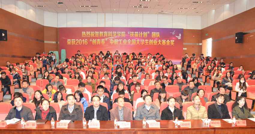 12月7日下午,教育科学学院举行“创青春”大学生创业大赛总结表彰大会,隆重表彰在2016“创青春”中航工业全国大学生创业大赛中获得金奖的“扶苗计划”团队。校党委副书记、副校长江应中,校党委常委、副校长蒋乃华出席表彰大会。教育科学学院院长邓宏宝主持会议。