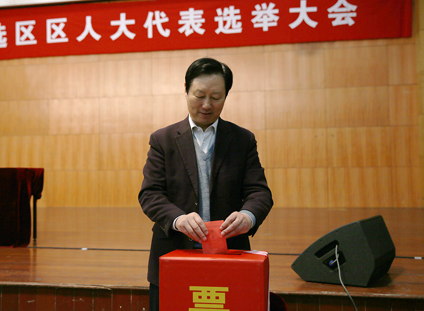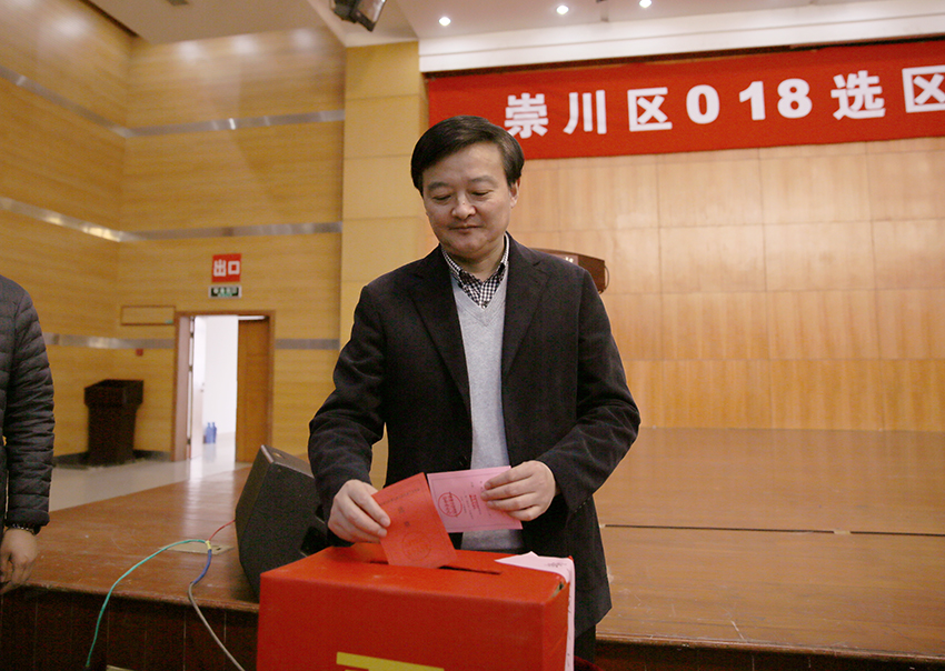 设在主校区大学生活动中心的崇川区018选区选举大会现场,国歌声嘹亮,现场气氛庄重、秩序井然。根据选举法和省选举实施细则的有关规定,大会通过了选举办法、监票人、计票人名单。下午2时30分许,校党委书记成长春、校长程纯等校领导在工作人员核验过选民证后,领取了选票,认真填写后走到票箱前,郑重投下各自的一票。