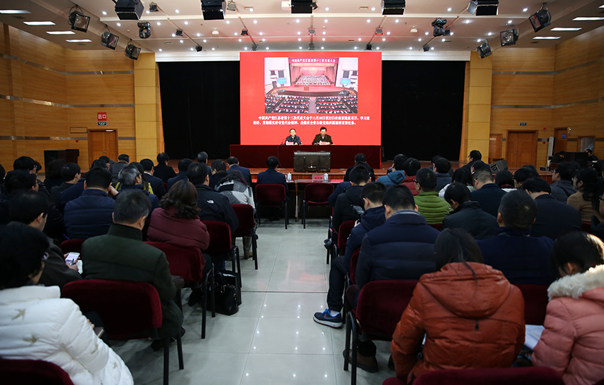 12月15日上午,beat365官网召开党委中心组学习(扩大)会议,聆听省委宣讲团成员、新华日报社党委书记、社长周跃敏专题宣讲省第十三次党代会精神。校党委书记成长春主持会议,校党委副书记、校长程纯出席会议。