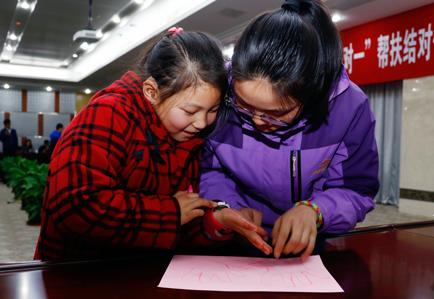 启动仪式后,伯藜学社组织教员和孩子们开展了首次素质拓展活动。在彩笔的描绘下,一大一小两只手掌,在画纸上紧紧相牵,大学生教员和孩子们用画笔在对方的掌心写下了自己的兴趣爱好,大朋友和小朋友开始变成一家人。