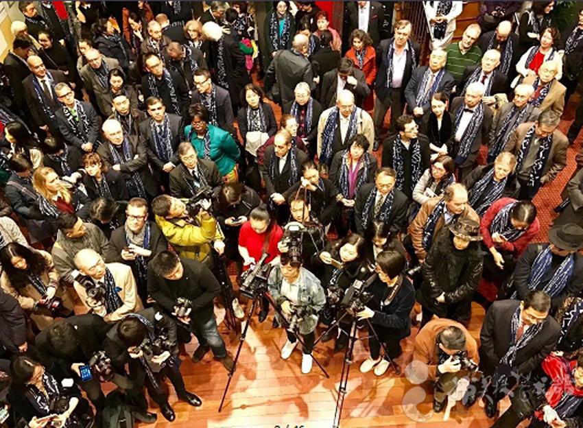 三百余名到场嘉宾同时围戴蓝印花布真丝围巾作品。