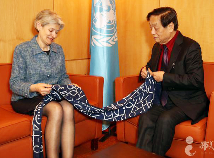 中国工艺美术大师韩美林向联合国教科文组织总干事博科娃介绍蓝印花布制作技艺。