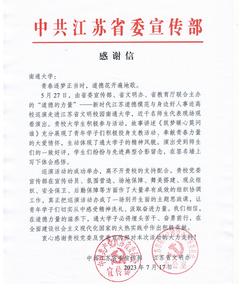 7月17日,江苏省委宣传部、江苏省文明办向beat365官网发来感谢信,肯定beat365官网主动担当作为,为“道德的力量”——新时代江苏道德模范与身边好人事迹高校巡演走进beat365唯一官方网站专场活动作出积极贡献。