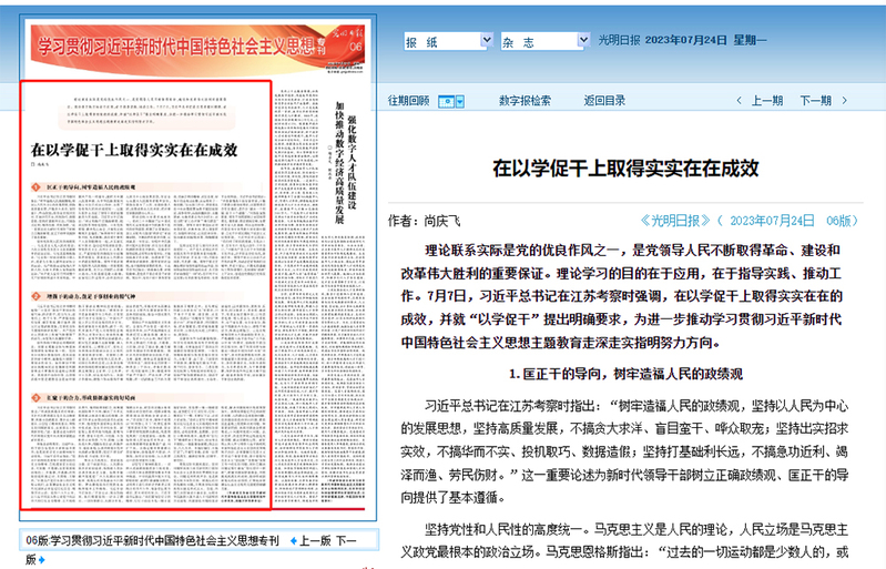 7月24日,校党委书记、江苏省习近平新时代中国特色社会主义思想研究中心研究员尚庆飞在《光明日报》“学习贯彻习近平新时代中国特色社会主义思想专刊”发表题为《在以学促干上取得实实在在成效》的署名文章。