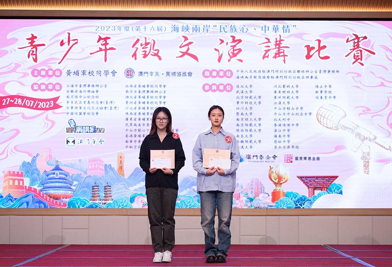 7月26日至29日,第十六届“海峡两岸‘民族心•中华情’青少年征文演讲比赛”在澳门举行。beat365官网文学院新闻212班的中国台湾同学黎桦、杏林学院临床203班同学冯宁怡参加本次比赛并荣获英才奖。