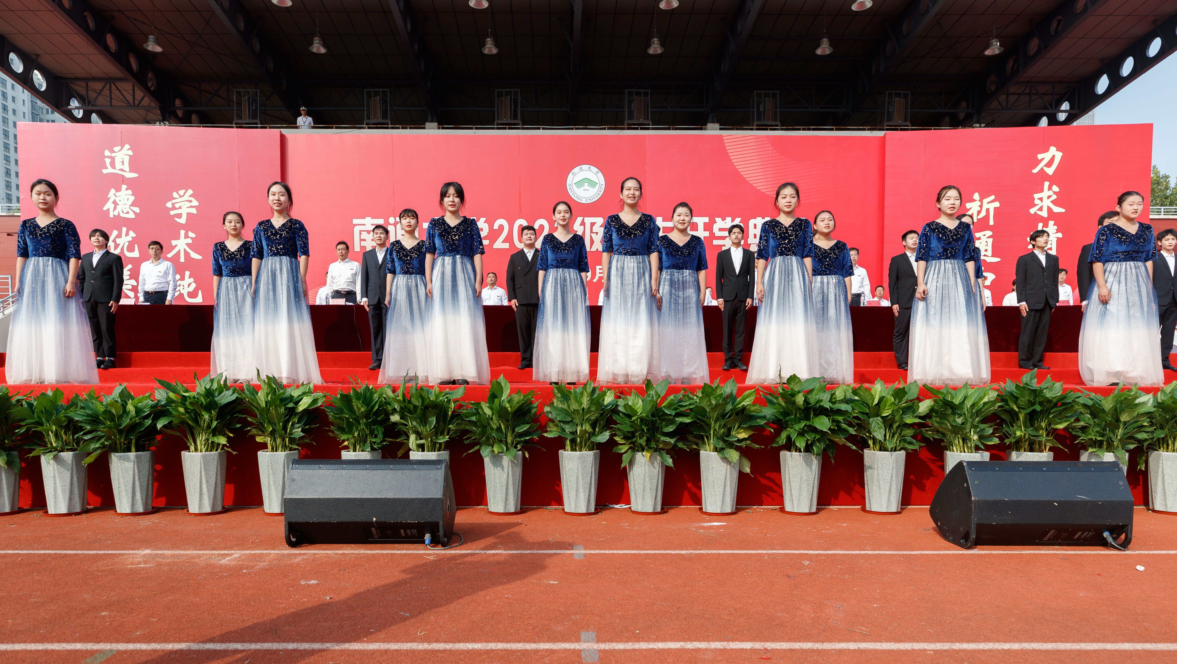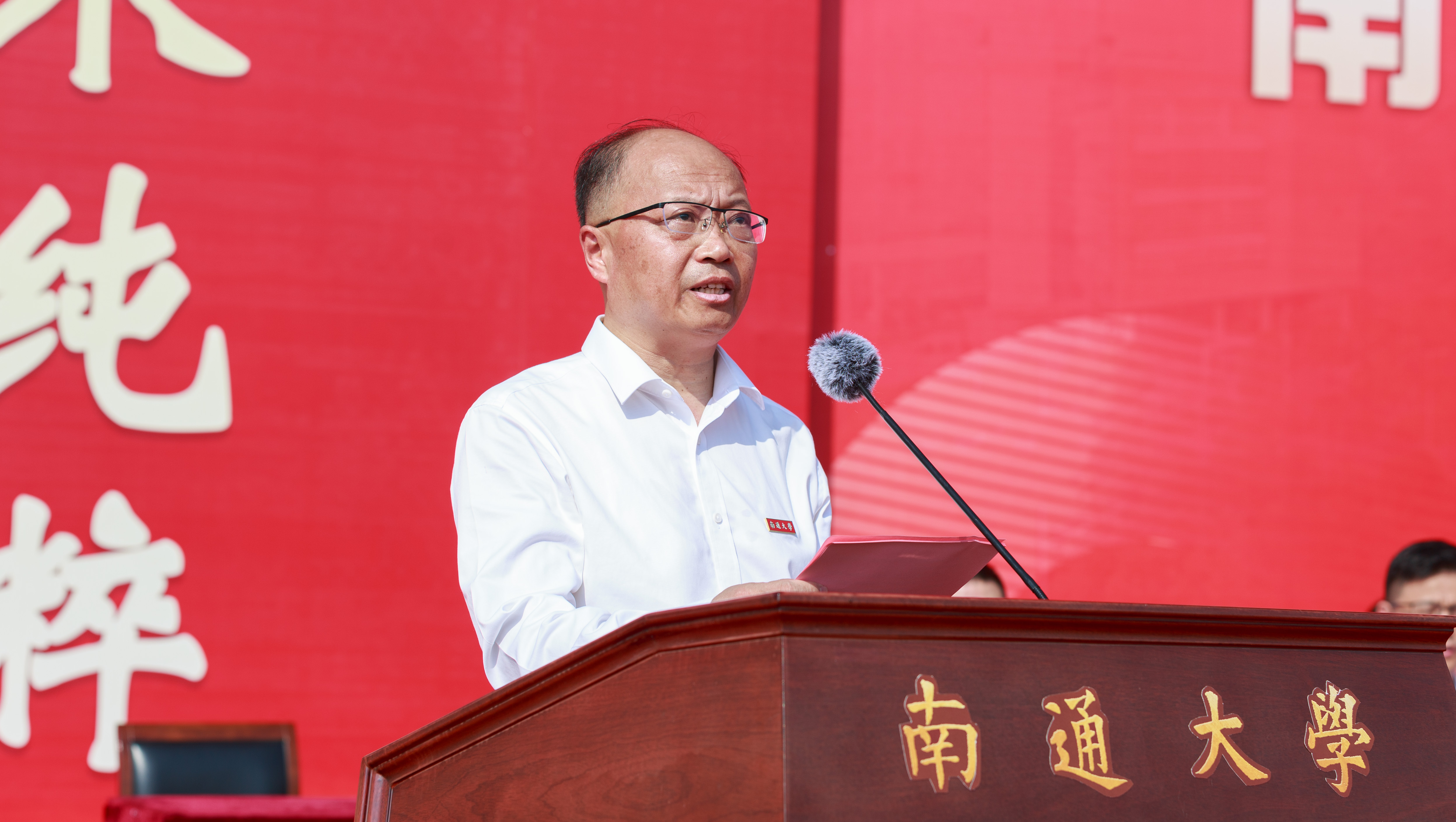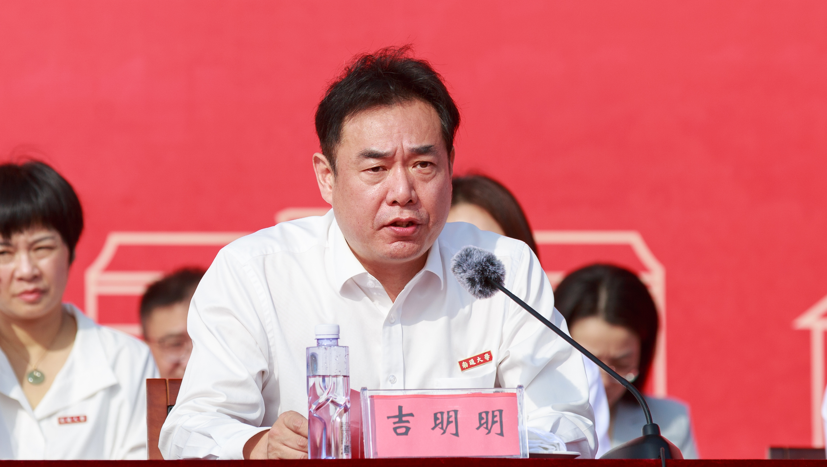 吉明明在主持中表示,一枚小小的校徽,代表着同学们从这一刻开始,正式成为一名新时代通大人。老师的殷勤教诲、学长学姐的热切期盼,都将化为大家继续前进的不竭动力。他希望同学们牢记“祈通中西,力求精进”的校训,博学笃实,踔厉奋发,用生命中最宝贵的青春时光,为自己谱写最绚丽的人生篇章;希望同学们牢记师长的寄语与教诲,坚守本心,专注学习,磨练意志,用拼搏和努力去创造更加美好的未来,用青春和奋斗汇聚起时代前行的磅礴力量。