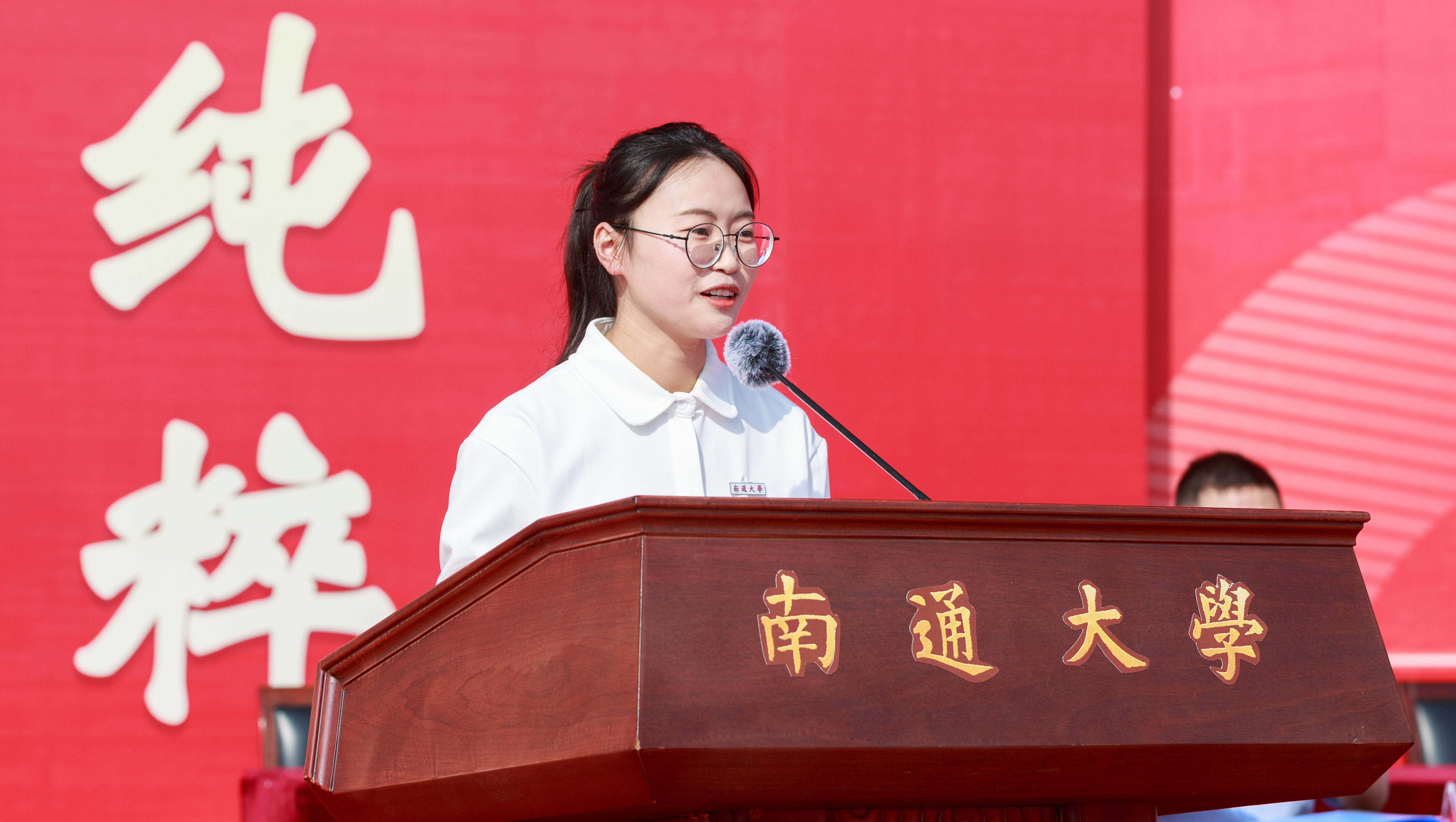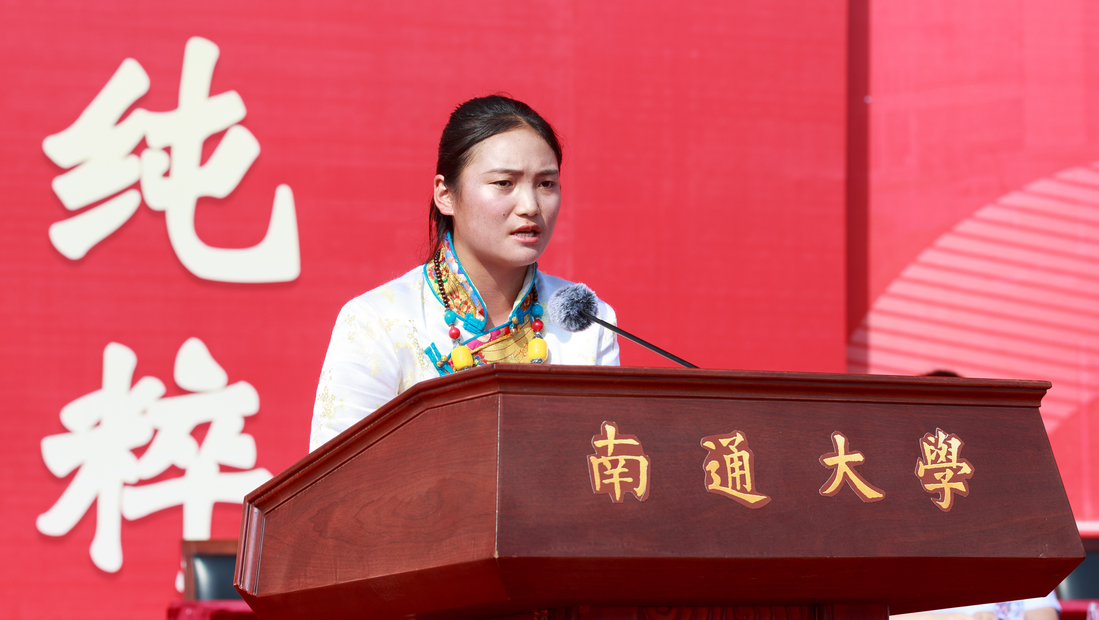 马克思主义学院思想政治教育(师范)专业政教师范231班斗改吉作为本科新生代表发言。她讲述了自己受到莫文隋研究生支教团支教老师的教导和指引而圆梦通大的经历。她表示将传承通大精神,高扬理想风帆;钻研学术知识,矢志报效祖国;释放青春激情,追逐青春梦想;做胸怀祖国、追求卓越的新时代新通大人。