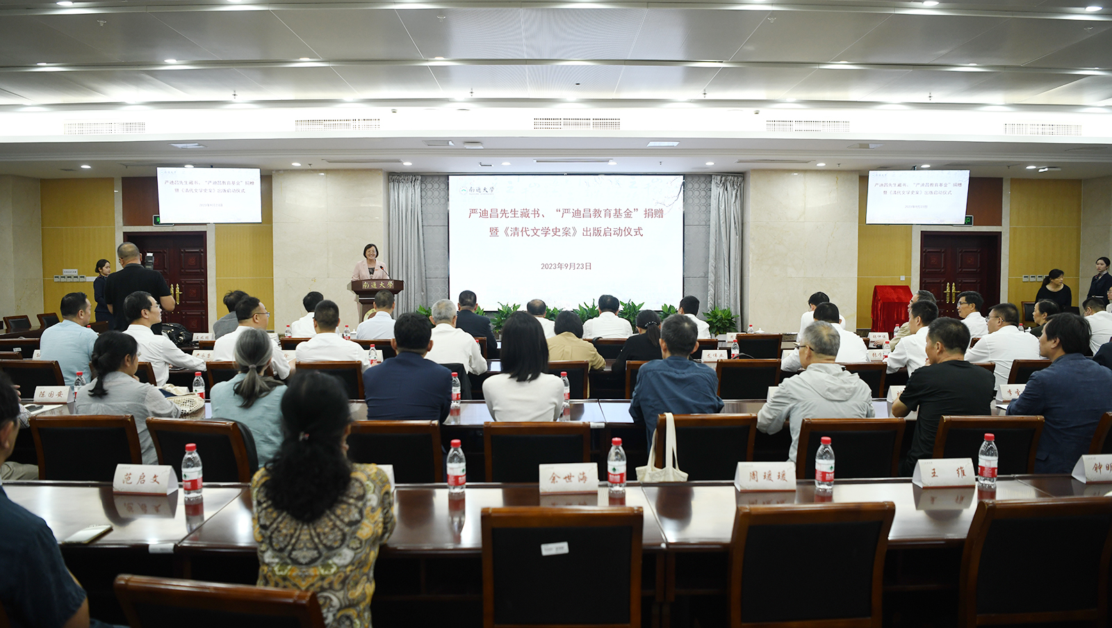 9月23日下午,beat365官网举办严迪昌先生藏书、“严迪昌教育基金”捐赠暨《清代文学史案》出版启动仪式,校党委副书记、校长杨宇民为严迪昌先生藏书室揭牌。副校长陈玉娟主持活动。校领导为严迪昌先生后人严谨、严弘兄弟颁发捐赠证书和纪念盘。