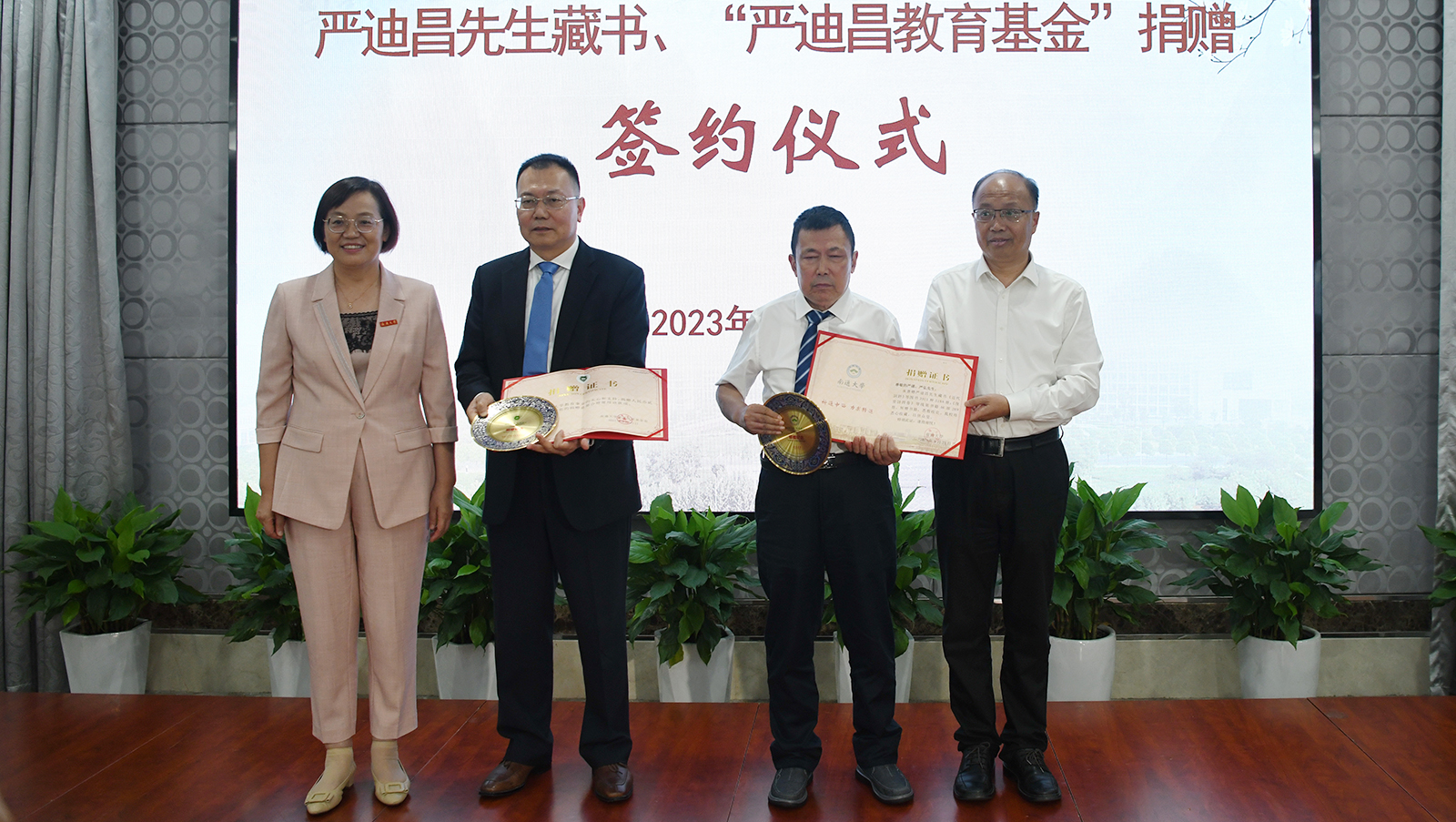 校领导为严迪昌先生后人严谨、严弘兄弟颁发捐赠证书和纪念盘