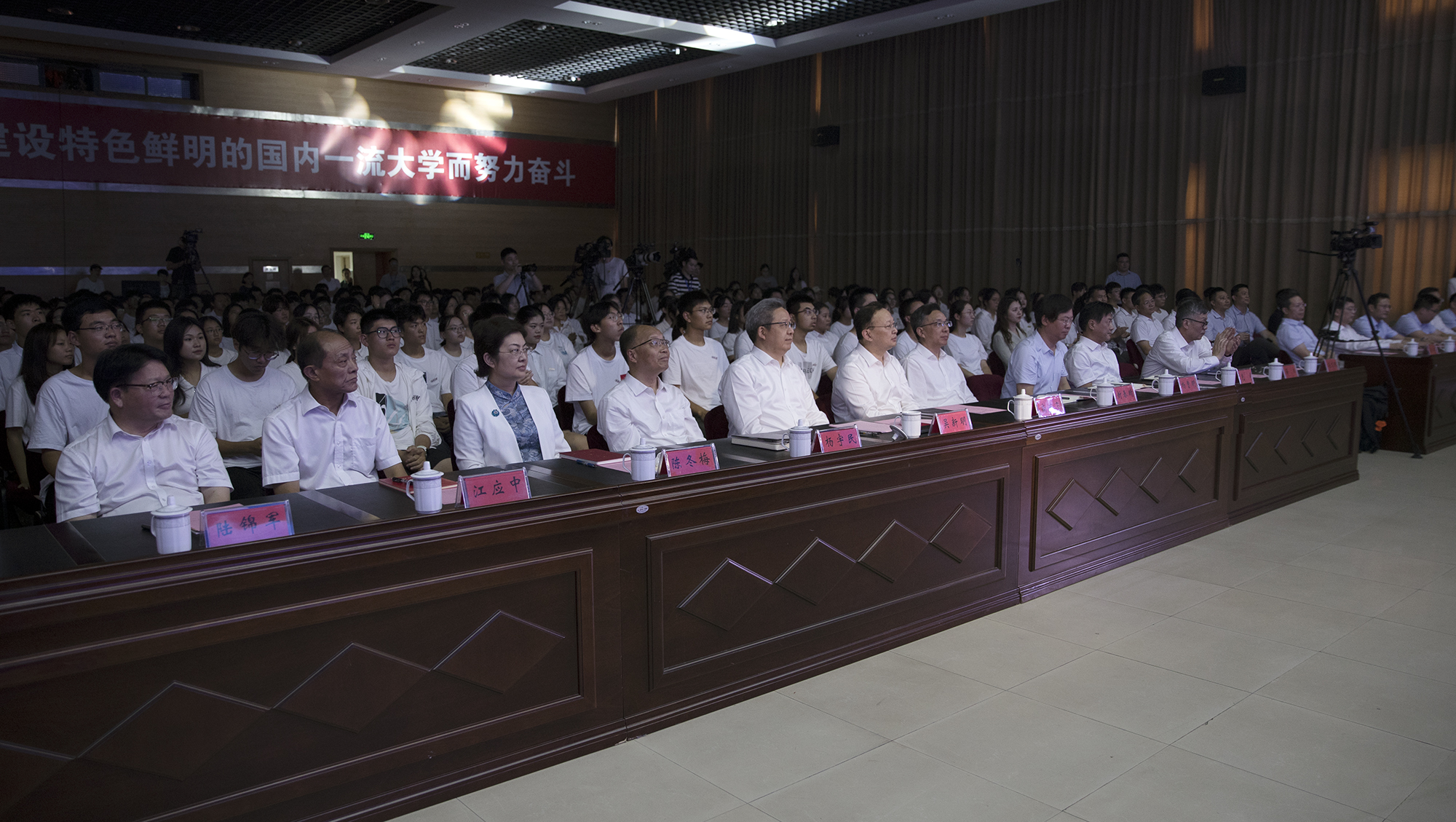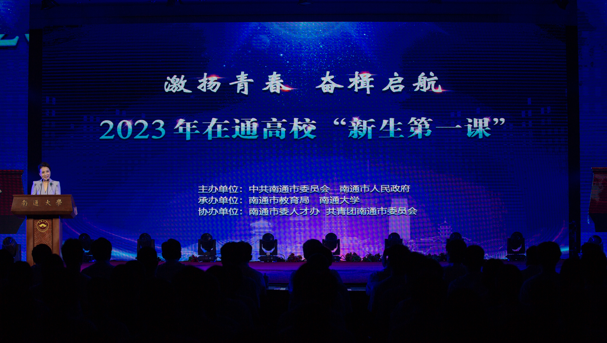 9月27日,2023年在通高校“新生第一课”在beat365官网开讲。南通市委书记、市人大常委会主任吴新明与新生共阅“南通”这本书,寄语广大学子心怀梦想、不负韶华,练就真才实学、习得过硬本领,在南通踏上难忘的筑梦、追梦、圆梦之旅,并向广大学子发出邀约:学成之后,扎根南通,做南通发展的合伙人,与南通共同成长、携手走向梦想的彼岸。南通市领导封春晴、陈冬梅、杨曹明,校党委书记尚庆飞,校党委副书记、校长杨宇民以及其他在通高校党委主要负责同志出席活动。