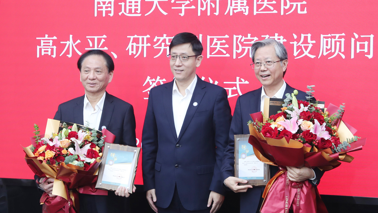 施炜代表附属医院分别与顾晓松院士、高建林教授签约,并向他们颁发高水平研究型医院建设顾问聘书。