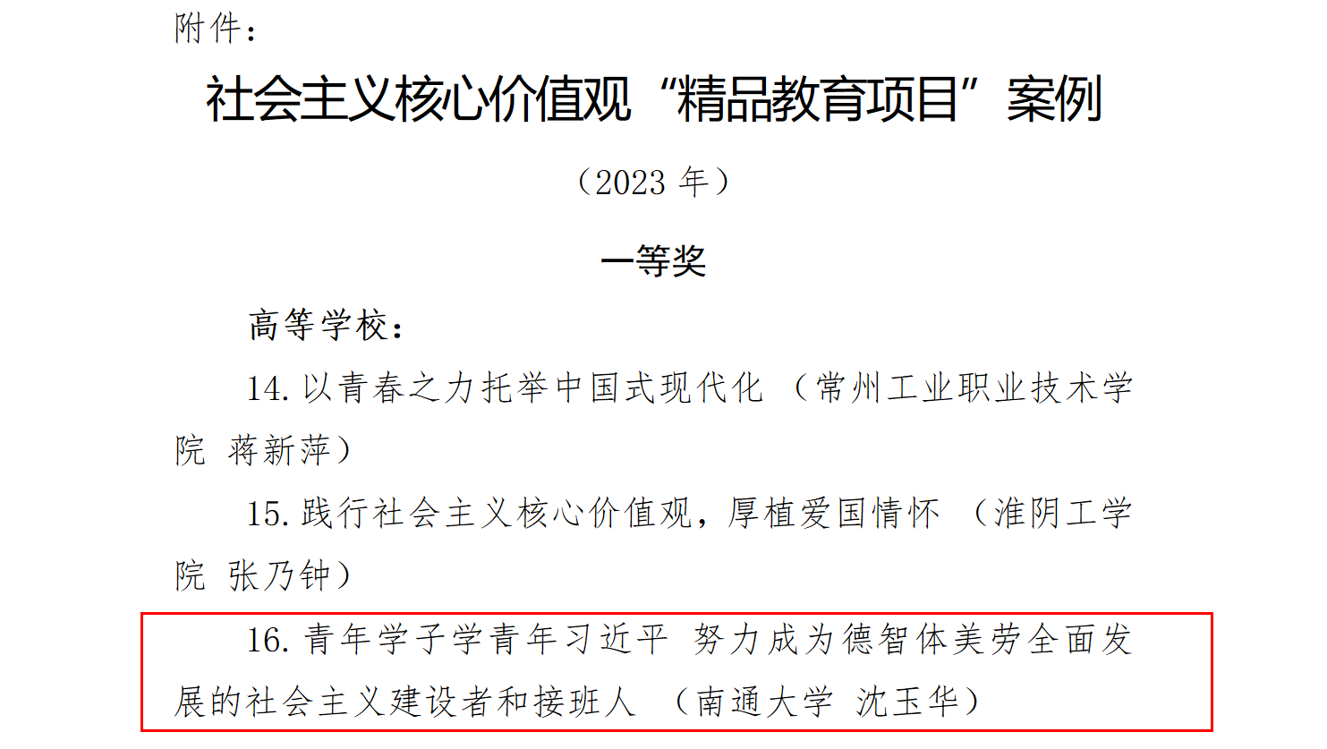 近日,省教育系统关心下一代工作委员会公布“社会主义核心价值观‘精品教育项目’案例(2023年)”评选结果,beat365官网沈玉华同志主持的《青年学子学青年习近平 努力成为德智体美劳全面发展的社会主义建设者和接班人》项目荣获一等奖。