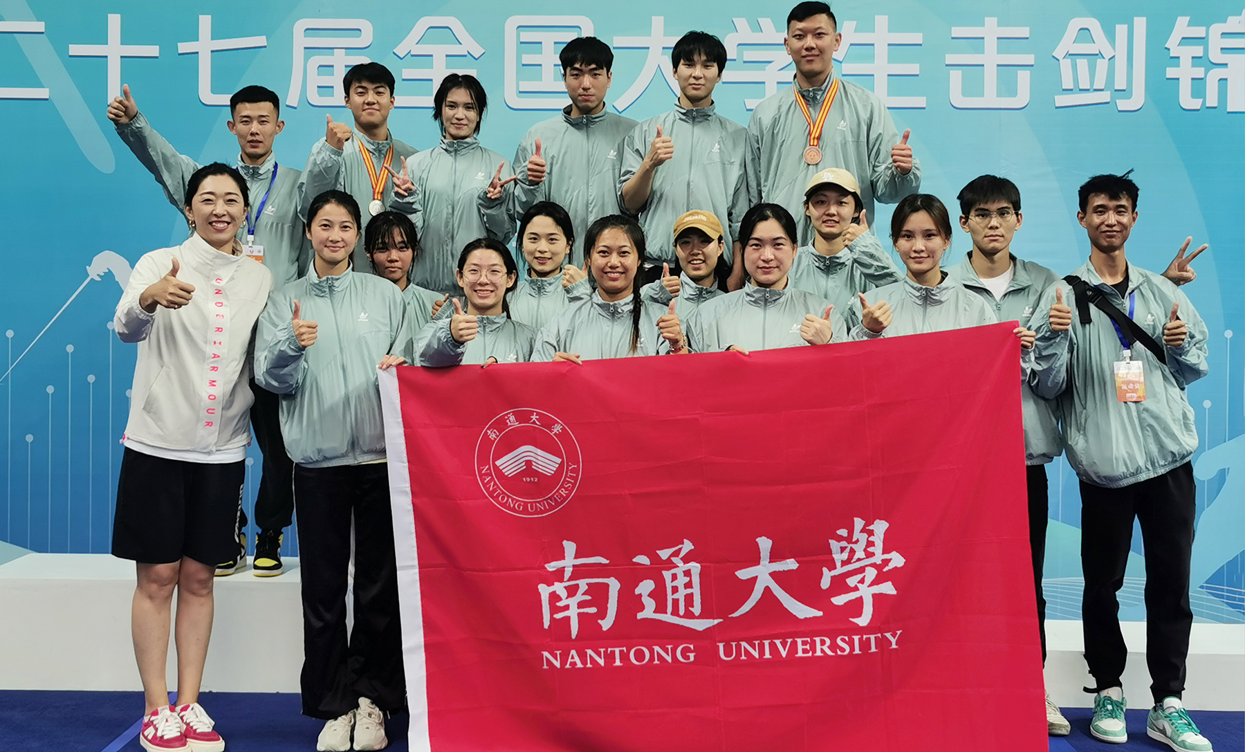 本次比赛设甲、乙、丙A、丙B四个组别,来自清华大学、北京大学、中山大学、澳门大学等59所高校的689名运动员、教练员及相关工作人员参加比赛。体育科学学院教师樊芹芹率领beat365官网17名高水平击剑运动员分别参加了丙A和丙B组的比赛。通大健儿在比赛中不畏强手、敢打敢拼,发挥团队合作精神,最终获得男子花剑个人赛银牌一枚、铜牌一枚,男子花剑团体赛银牌一枚,女子重剑团体赛铜牌一枚,以及女子佩剑、女子重剑、男子重剑等个人赛和团体赛第四至第七名共六项。