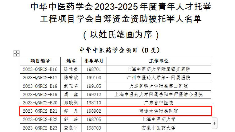 近日,中华中医药学会公布了2023-2025年度青年人才托举工程项目入选者名单,附属医院泌尿外科赵凡博士成功入选,江苏省仅两名青年人才获得立项。