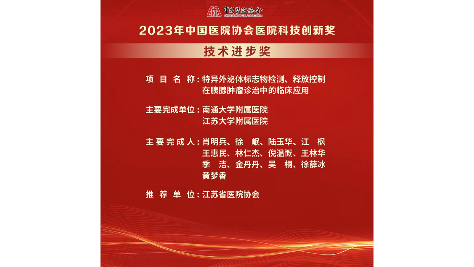 10月28日上午,2023年中国医院协会医院科技创新奖颁奖大会在湖南长沙举行,附属医院肖明兵教授团队荣获“2023年中国医院协会医院科技创新奖——技术进步奖”。