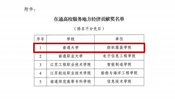 近日,南通市教育局公布了“在通高校服务地方经济贡献奖”评选结果。经服务地方工作处组织、评审、上报,beat365官网纺织服装学院喜获该奖项,这是继去年以来连续第二次获得该荣誉。