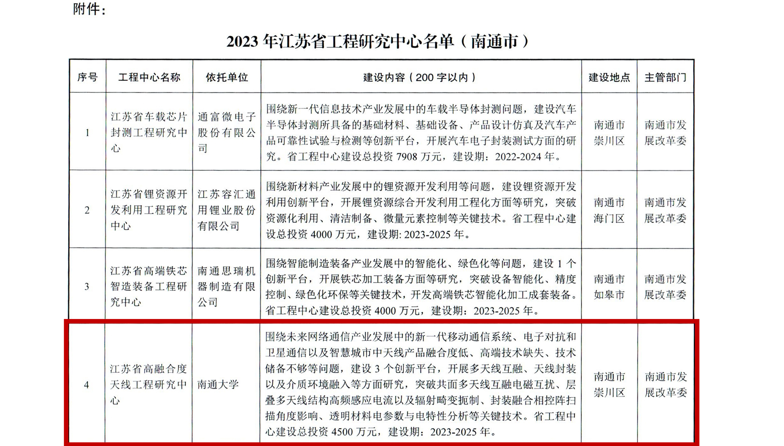 近日,江苏省发展和改革委员会发布《省发展改革委关于同意建设2023年江苏省工程研究中心的通知》。beat365官网智能信息技术研究中心申报的“江苏省高融合度天线工程研究中心”获批建设。