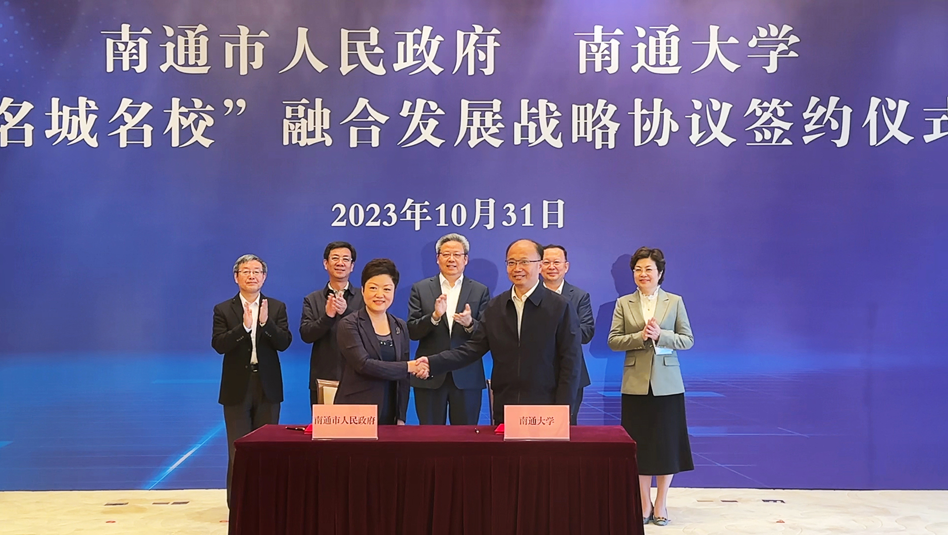 南通市委副书记、市长张彤,校党委副书记、校长杨宇民签订“名城名校”融合发展战略协议