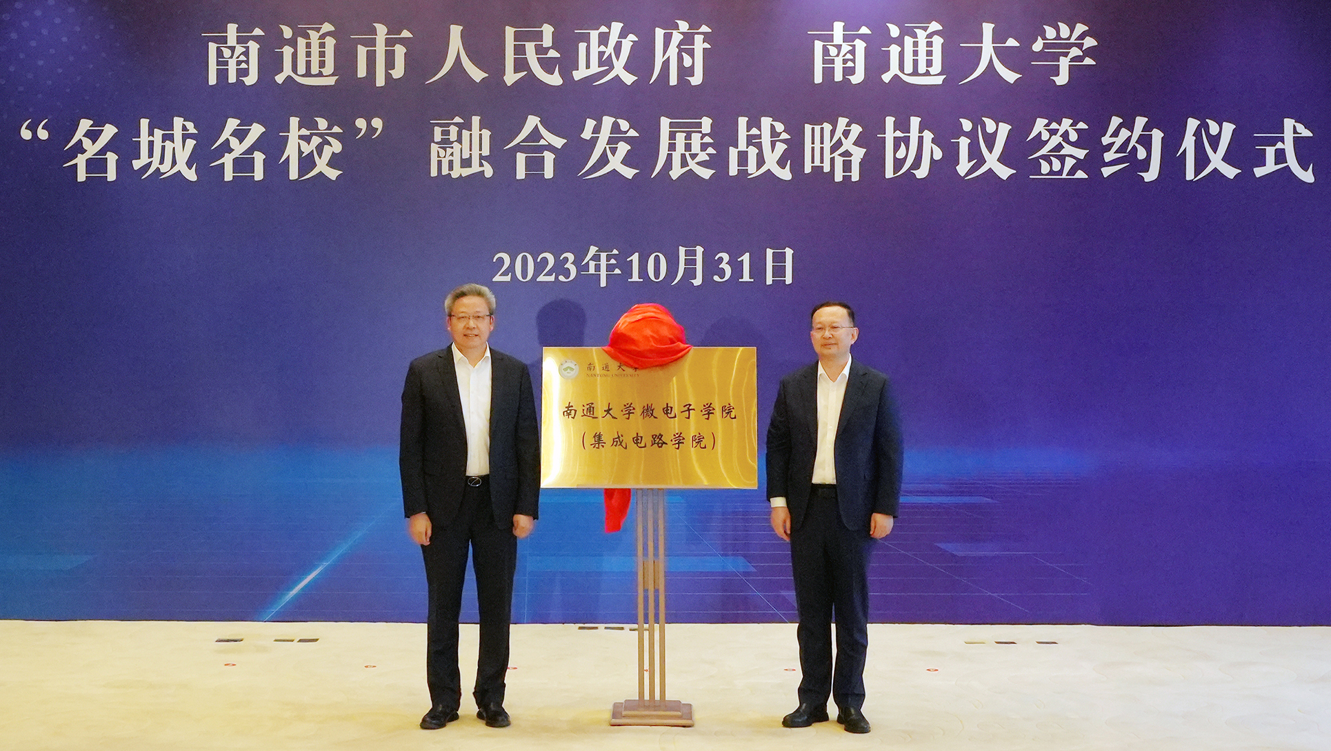beat365官网在特色鲜明的国内一流大学建设新征程中迎来新的里程碑。10月31日,南通市人民政府、beat365唯一官方网站举行“名城名校”融合发展战略协议签约仪式。南通市委书记吴新明、校党委书记尚庆飞共同为beat365唯一官方网站微电子学院(集成电路学院)揭牌。南通市委副书记、市长张彤,校党委副书记、校长杨宇民签订“名城名校”融合发展战略协议。南通市委常委、宣传部部长、副市长陈冬梅主持签约仪式。