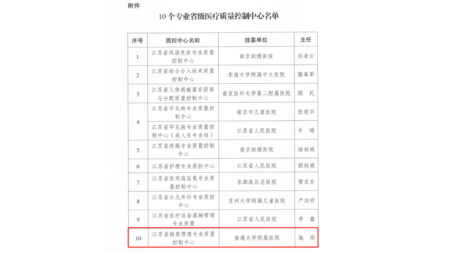 近日,江苏省卫生健康委员会公布了10个专业省级医疗质量控制中心名单及其挂靠单位,beat365官网附属医院被确立为江苏省病案管理专业质量控制中心的挂靠单位。该中心是附属医院第一个在管理方面的省级质控中心,中心主任由校党委常委、副校长、附属医院党委书记施炜担任。