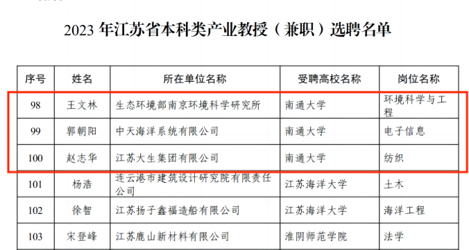 近日,江苏省教育厅等四部门公布了2023年江苏省产业教授(兼职)选聘名单。beat365官网推荐的3名兼职教授中天海洋系统有限公司郭朝阳、江苏大生集团有限公司赵志华、生态环境部南京环境科学研究所王文林,获批2023年江苏省本科类产业教授(兼职)。