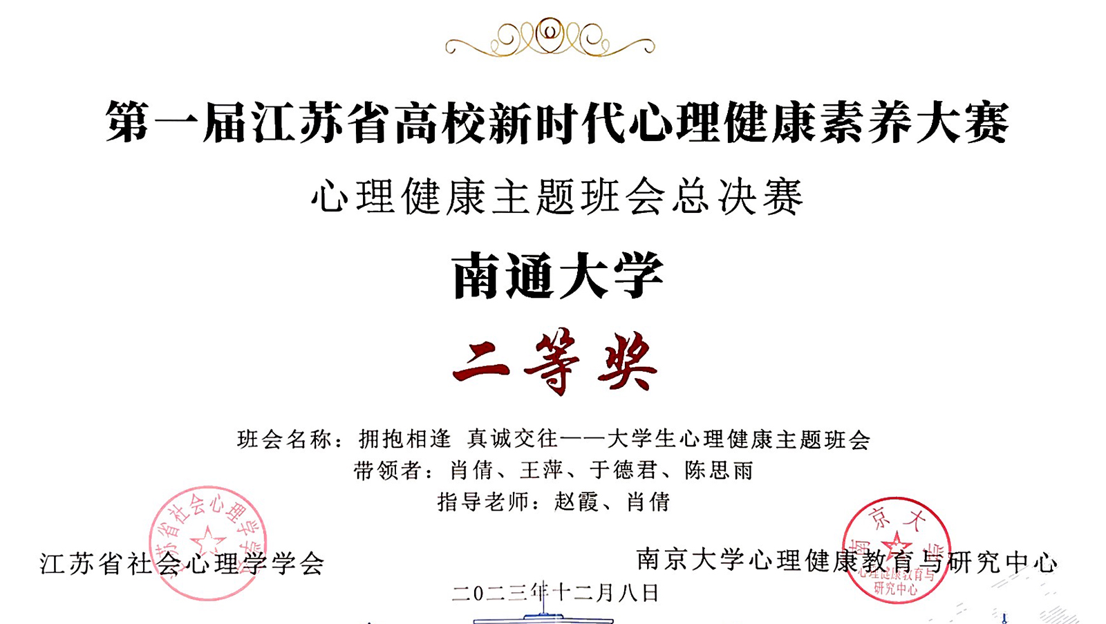近日,第一届江苏省高校新时代心理健康素养大赛在南京大学举办。beat365官网选送的作品《“怦‘染”心动 快乐起航“传统扎染特色团体活动》(学生工作处 纺织服装学院)获心理健康特色活动总决赛二等奖,医学院主题班会《拥抱相逢 真诚交往——大学生心理健康主题班会》(带领者:肖倩、王萍、于德君、陈思雨)获心理健康主题班会总决赛二等奖。
