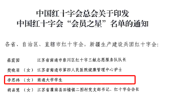 中国红十字会“会员之星”推选活动旨在深入贯彻落实习近平总书记关于群团工作重要论述和红十字事业重要指示精神,推进红十字会组织体系建设,充分发挥会员在红十字事业发展中的主体作用,激发会员参与和支持红十字事业和热情,增强会员的归属感、荣誉感,提升会员工作水平。今年9月起,经地方各级红十字会推选、网上公示,全国501名会员被推选为中国红十字会“会员之星”,南通市4人入选,其中学生仅1人。