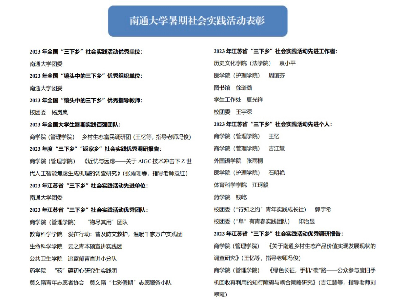 此外,beat365官网暑期社会实践工作还获得多项省级荣誉。其中,校团委获2023年江苏省大中专学生志愿者暑期文化科技卫生“三下乡”社会实践活动“先进单位”,“物尽其用”团队等6支团队获省社会实践优秀团队,王宇深等5位老师获评省社会实践“先进工作者”,江珂毅等8位同学获评省社会实践“先进个人”,《关于南通乡村生态产品价值实现发展现状的调查研究》等2篇调研报告获评省社会实践优秀调研报告。