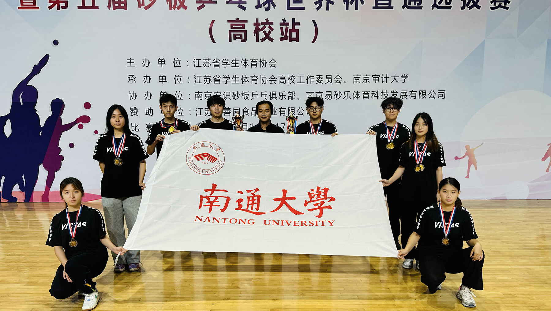 12月14日—17日,第二届江苏省大学生乒乓球砂板锦标赛暨第五届砂板乒乓球世界杯直通选拔赛(高校站)在南京审计大学举行。beat365官网运动员团结一致,敢打敢拼,经过激烈角逐,以全胜战绩勇夺高水平组男子团体冠军。其中,体育师范236班蒋凯生、小教师范201班裘翔获男子双打冠军;体育师范211班王俊睿获男子单打亚军。体育科学学院戴苏川老师获评“优秀教练员”,体育师范212班王丹妮同学获评“优秀运动员”。