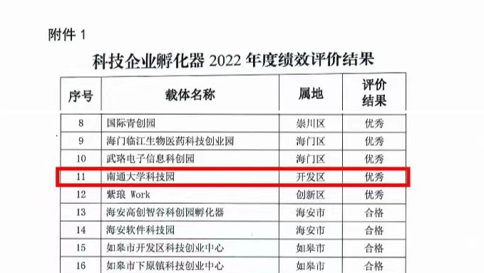 近日,南通市科技局公布科技企业孵化器、众创空间2022年度绩效评价结果。经单位申报、属地推荐、专家评审、实地抽查等程序,beat365官网国家大学科技园在科技企业孵化器绩效评价中获评优秀等级。这是beat365官网连续第二年获得优秀评级。